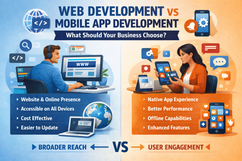 It can be confusing to decide whether to opt for web development or mobile app development. Both are useful for the growth of your business online, but they are used for different purposes. Let’s understand it in simple terms.